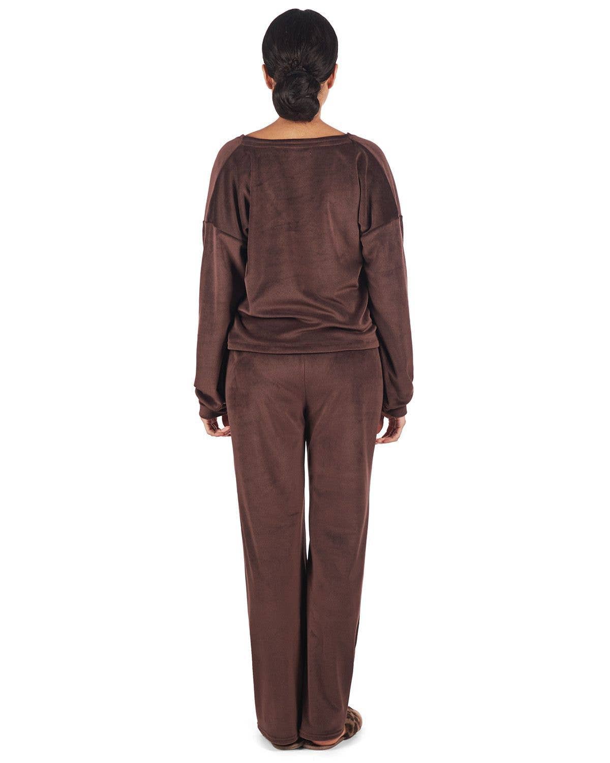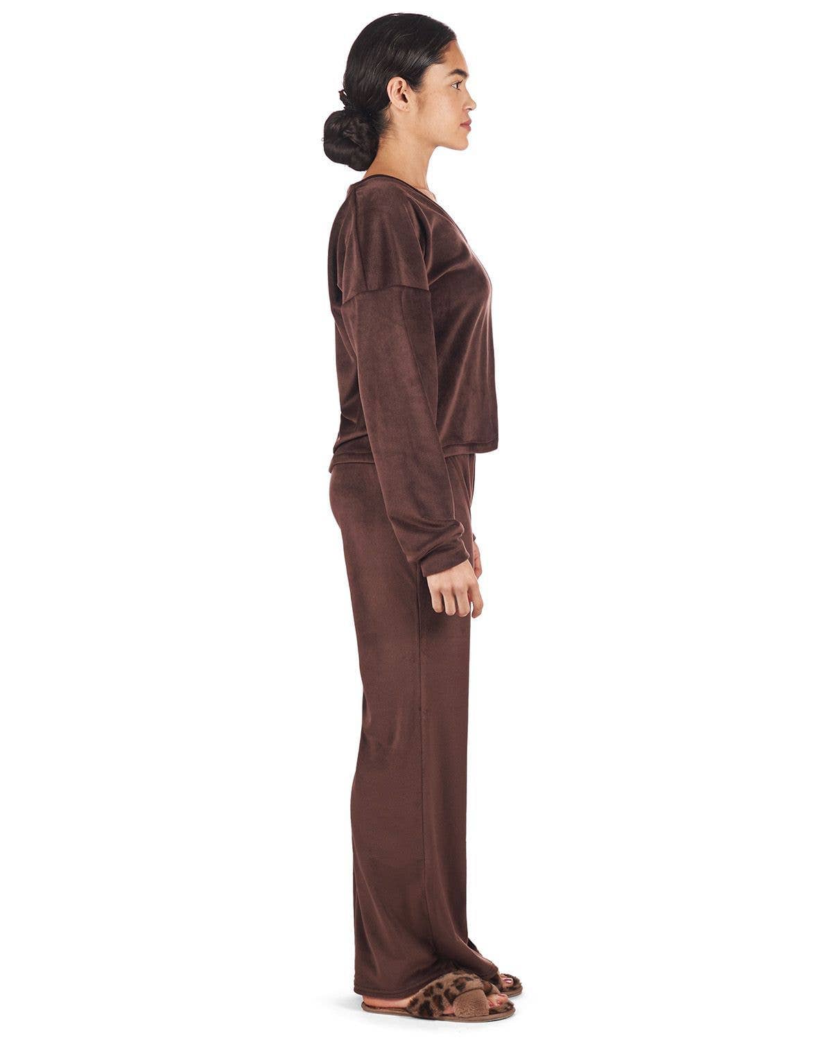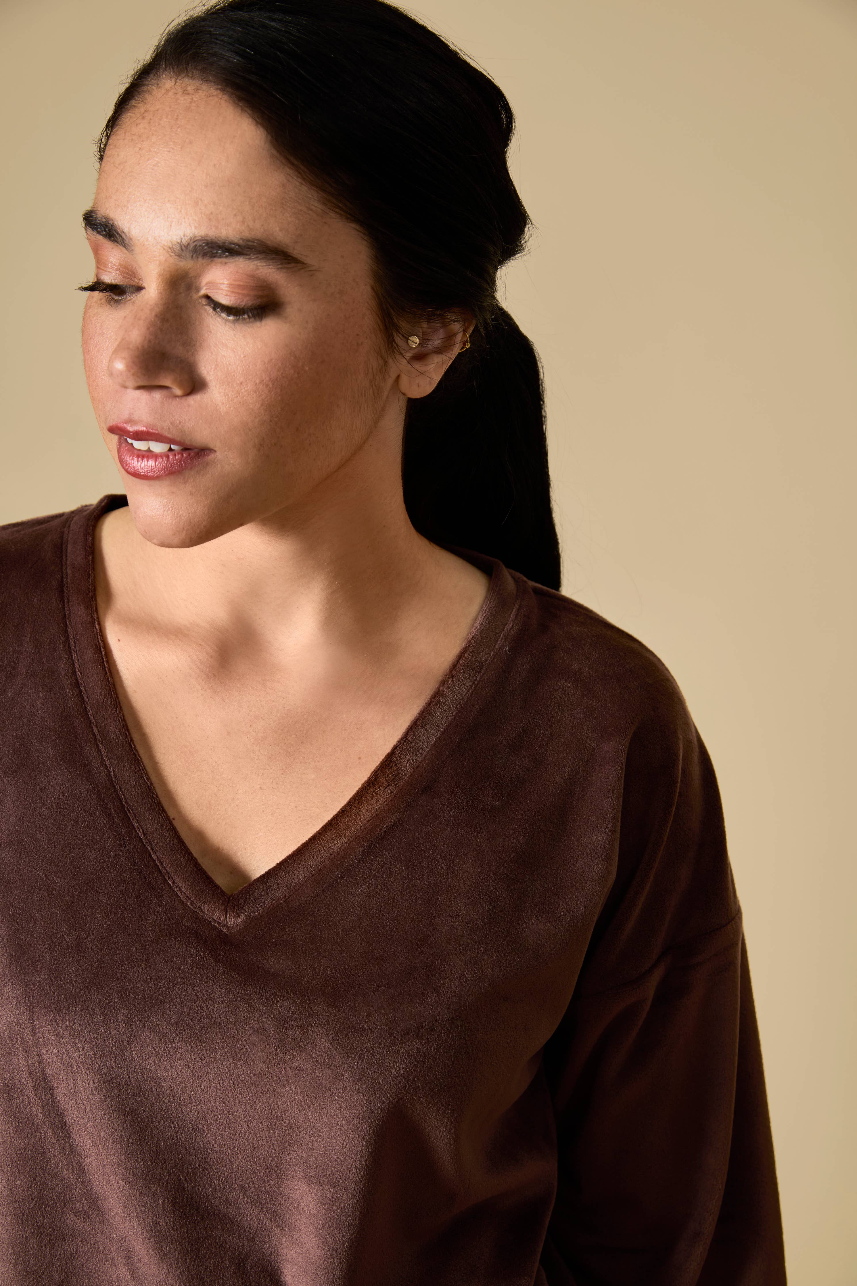 This velour V-neck pant set brings back classic comfort with a modern, cozy feel. Designed in a rich dark brown shade, it features a straight-cut pant and a long-sleeve V-neck top for relaxed, all-day wear. The plush velour fabric feels soft against the skin, making this set perfect for lounging, casual days, or staying warm in style.