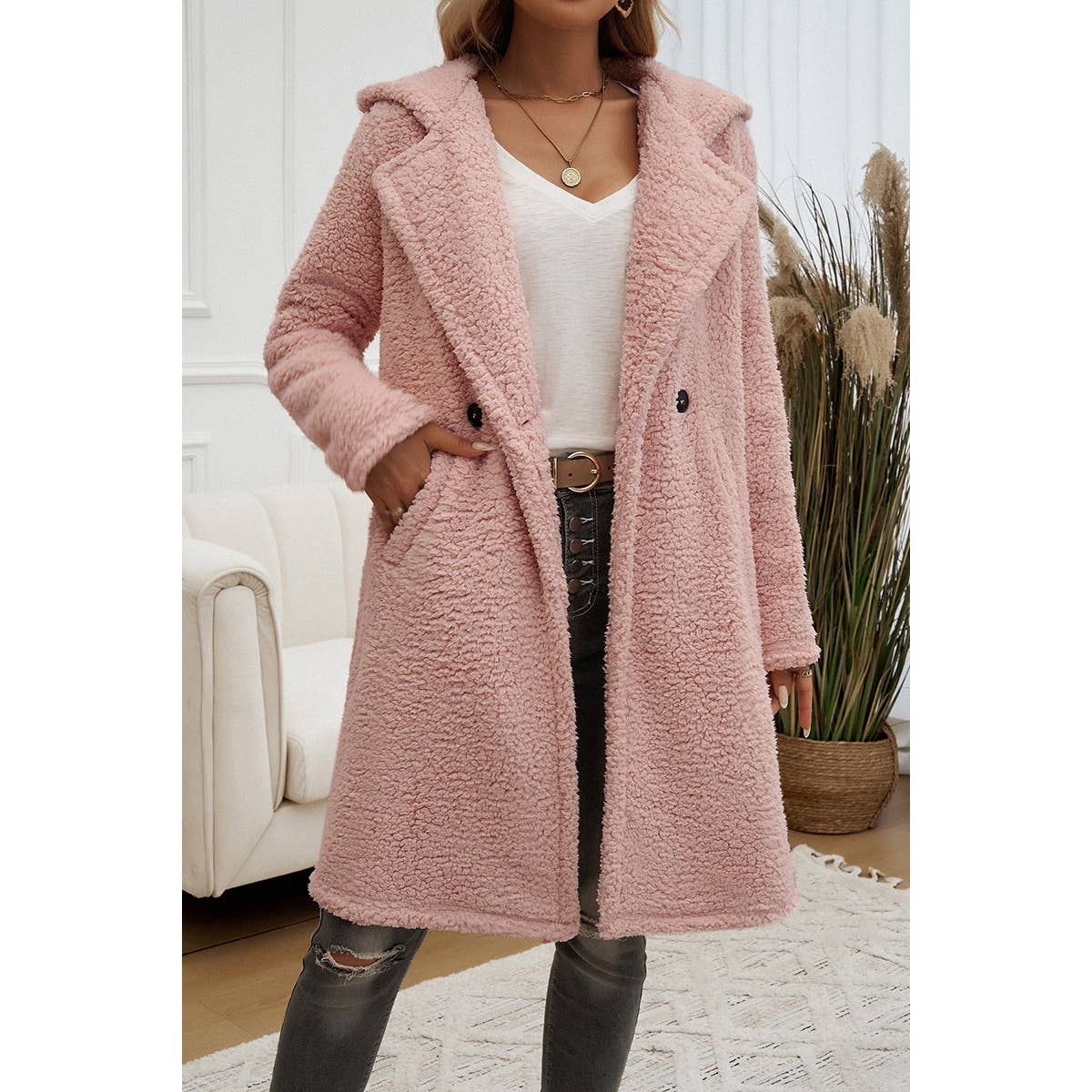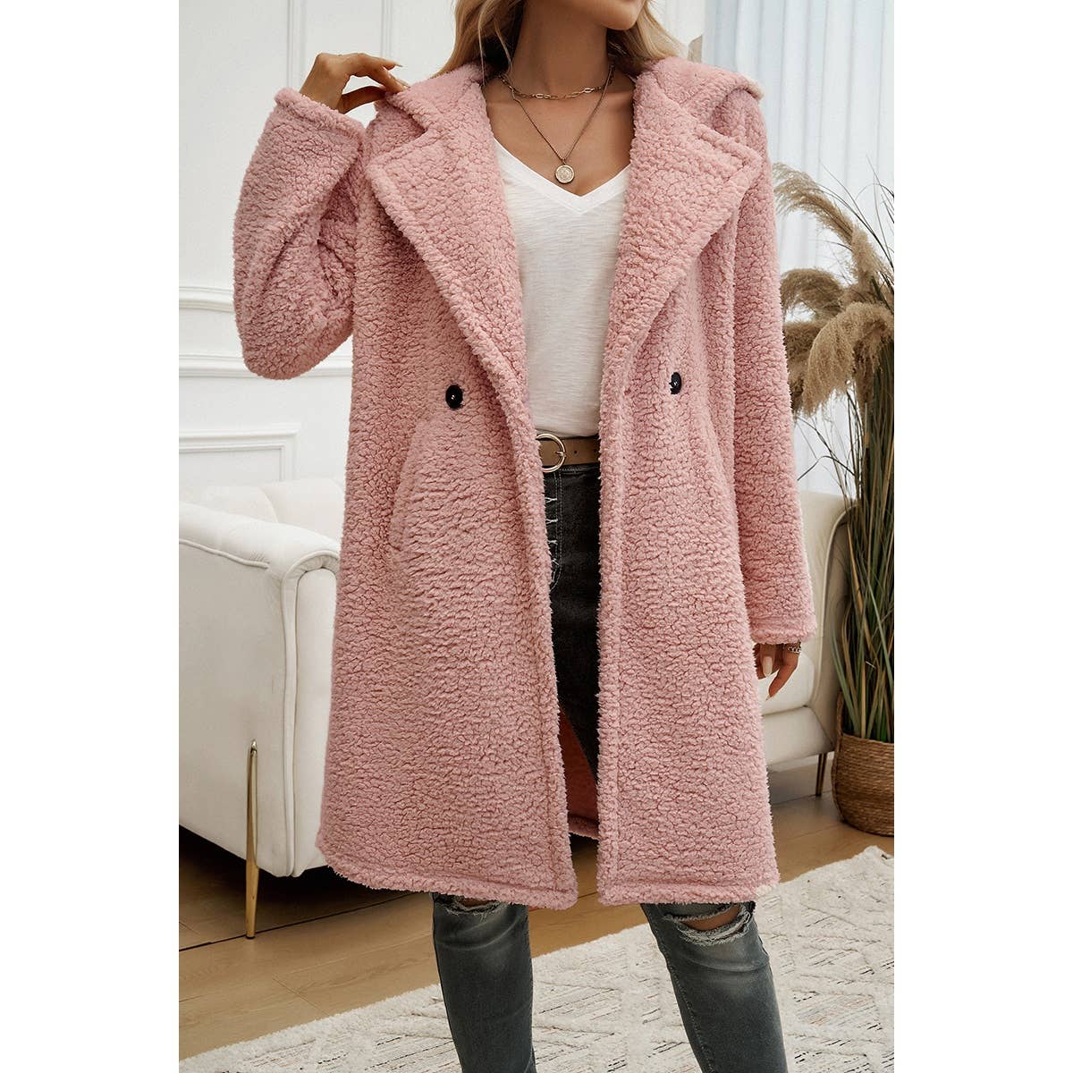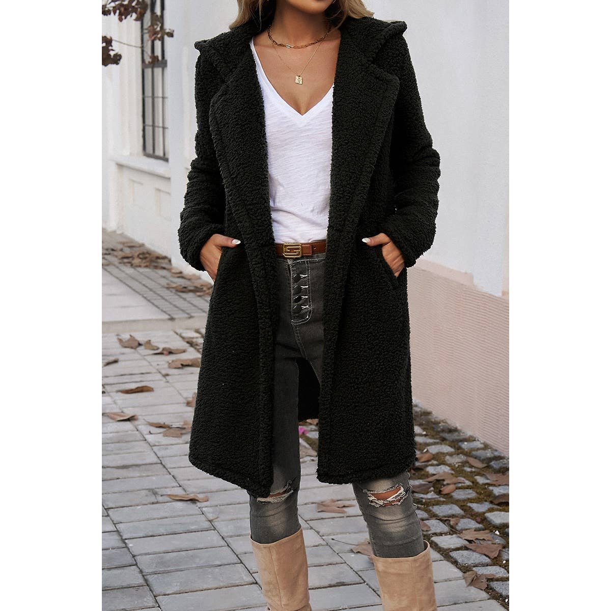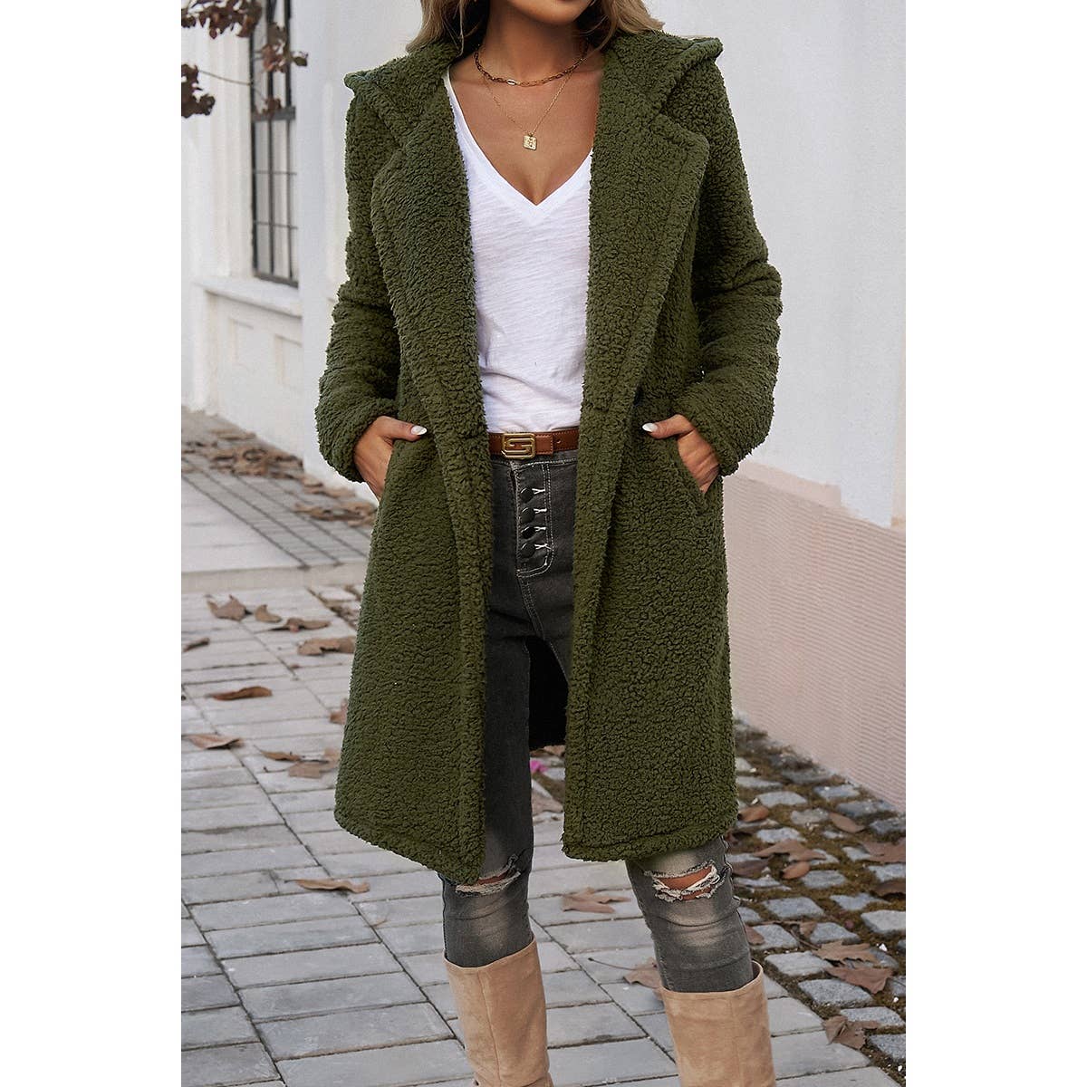Fuzzy Fleece Hooded Button Lapel Knee-Length Coat